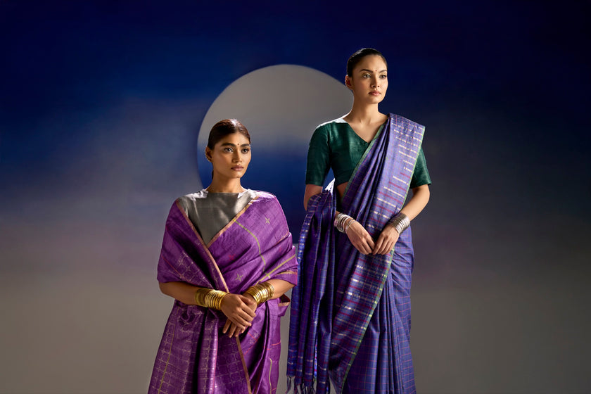 Charuta embodies the elegance of simplicity, brought to life through the union of handwoven Kosa and delicate Zari motifs. Each piece is a testament to the artistry passed down through generations of women, spun with love and crafted with care