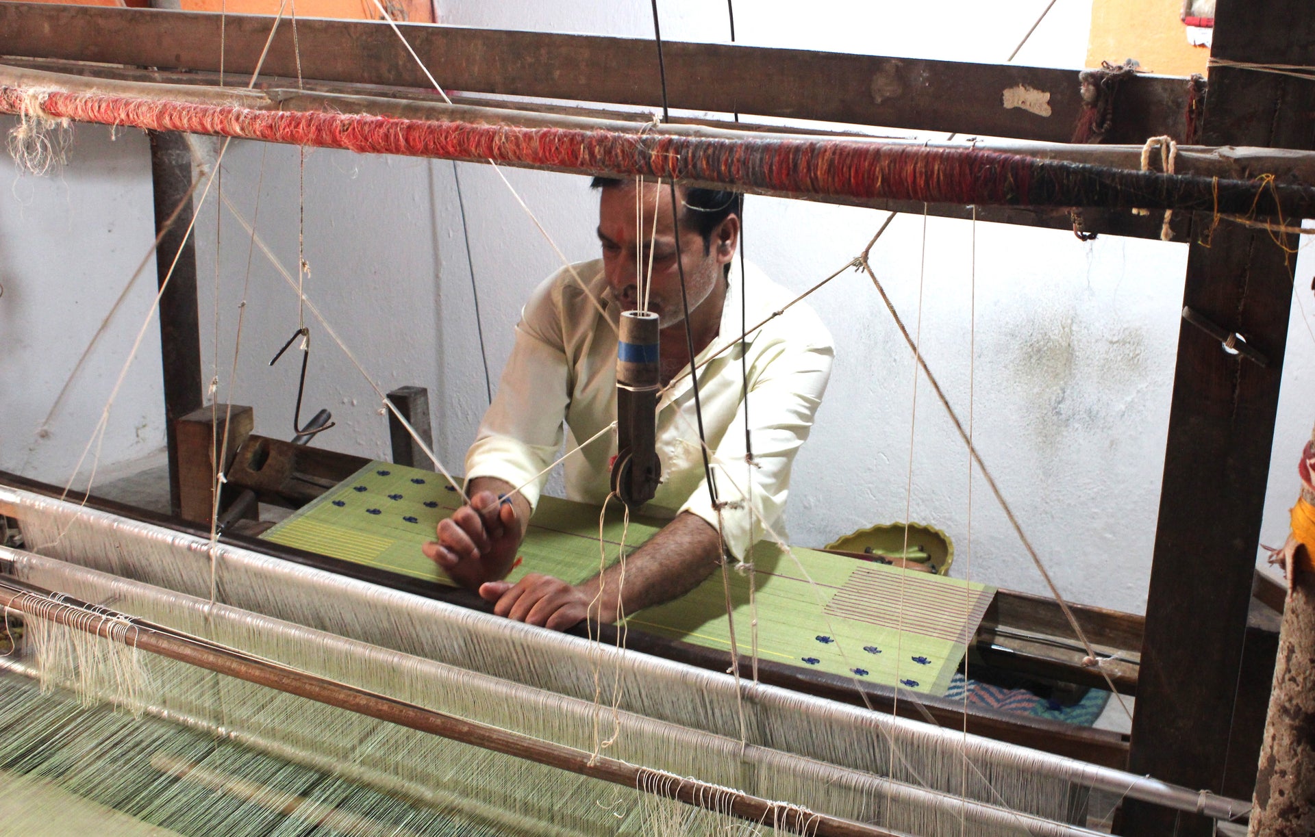 Jaala is a weaving technique used to create intricate motifs and patterns that are too complex for a standard dobby mechanism. In this method, each warp thread is individually tied to a specific horizontal thread that needs to be lifted simultaneously according to a pre-designed graph. The process requires two artisans: one sits behind the shafts, over the warp, manually lifting the jaala threads with a wooden hook after each pick to match the pattern’s repetition, while the other artisan weaves the fabric. This synchronised effort allows for the creation of elaborate and delicate designs.