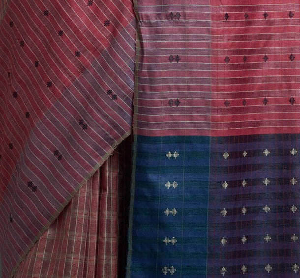 Khapa is a weaving technique used to insert extra weft threads to create simple geometric patterns, either in the border, pallu, or motifs across the body of a saree. A flat, smooth wooden tool called a 'Khapa' is inserted into the warp threads according to the desired placement, size, and width of the motif. The Khapa tool is then lifted to raise specific warp threads, allowing the extra weft to be manually woven through, forming the motif as it interlaces with the warp.
